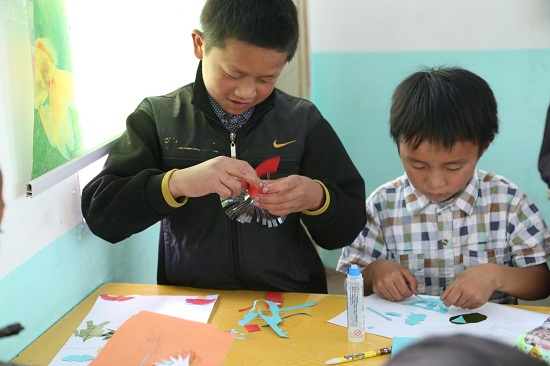 在海雀村的活動中,兩個小朋友在志愿者的幫助下認真的完成手工制作。
