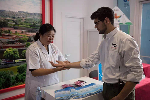 當薩仁在中國館尾廳進行綠色中醫(yī)針灸展示時,不時有好奇的游客上來體驗。一位在中國館交流的美國館志愿者也想親身體驗中醫(yī)針灸。短暫的號脈后,薩仁說:“這小伙子體格很好,就是手腳會在冬天發(fā)涼!闭f著便幫美國館志愿者進行舒解經(jīng)絡的治療。