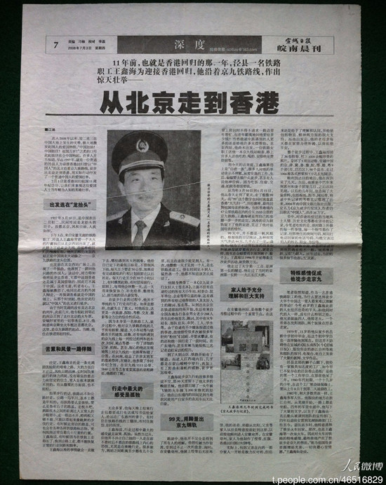 1997年對(duì)中國人來說,是難忘的一年。香港終于結(jié)束了英國殖民地身份,回歸祖國懷抱。為迎接這一歷史性時(shí)刻,1997年3月10日下午3點(diǎn),安徽蕪湖鐵路職工、涇縣人王鑫海背起一個(gè)大大的行囊獨(dú)自從北京西站出發(fā),踏上徒步京九線、迎接香港回歸的漫漫征程。