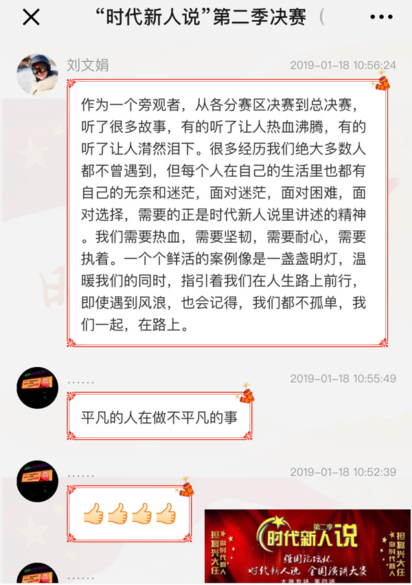 網(wǎng)友“新月”留言說(shuō):擔(dān)復(fù)興大任,做時(shí)代新人,我們每一個(gè)人都應(yīng)該是參與者、擔(dān)當(dāng)者、建設(shè)者。這次時(shí)代新人說(shuō)大型講述活動(dòng),為我們明確了坐標(biāo)。