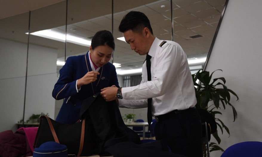 春運期間,劉黎(航空安全員)與妻子練黎(乘務長)一同堅守崗位。(新華社)