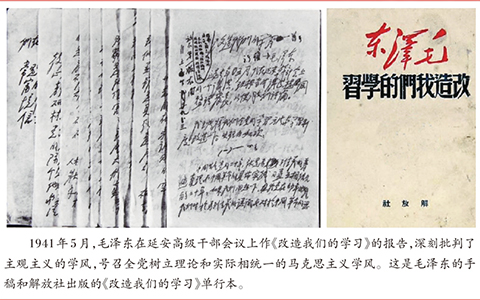 延安整風(fēng)運(yùn)動(dòng)以反對(duì)主觀主義、宗派主義、黨八股,樹(shù)立馬克思主義作風(fēng)為主要內(nèi)容。而鑒于深重的思想之弊和慘痛的實(shí)踐教訓(xùn),反對(duì)主觀主義以整頓學(xué)風(fēng),成為開(kāi)展整風(fēng)運(yùn)動(dòng)的關(guān)鍵。整風(fēng)運(yùn)動(dòng)開(kāi)展后,毛澤東就緊緊抓住思想方法和作風(fēng)問(wèn)題不放。他在給中央研究組同志的信中指出:學(xué)習(xí)理論要“以研究思想方法論為主”。破除錯(cuò)誤的思想方法,暢行正確的思想作風(fēng),最重要的就是要遵循實(shí)事求是的思想路線,做到理論聯(lián)系實(shí)際!皩(shí)事求是”這個(gè)詞,并非毛澤東首創(chuàng),但把“實(shí)事求是”上升到黨的思想路線的高度,則是毛澤東的功勞。毛澤東強(qiáng)調(diào),“要分清創(chuàng)造性的馬克思主義和教條式的馬克思主義”,“宣傳創(chuàng)造性的馬克思主義”,“使中國(guó)革命豐富的實(shí)際馬克思主義化”。不能從理論上來(lái)思考中國(guó)革命實(shí)踐的人,是不能妄稱(chēng)為馬克思主義理論家的。只有從客觀實(shí)際中概括出而又在客觀實(shí)際中得到證明的理論,才稱(chēng)得起我們所講的理論。
