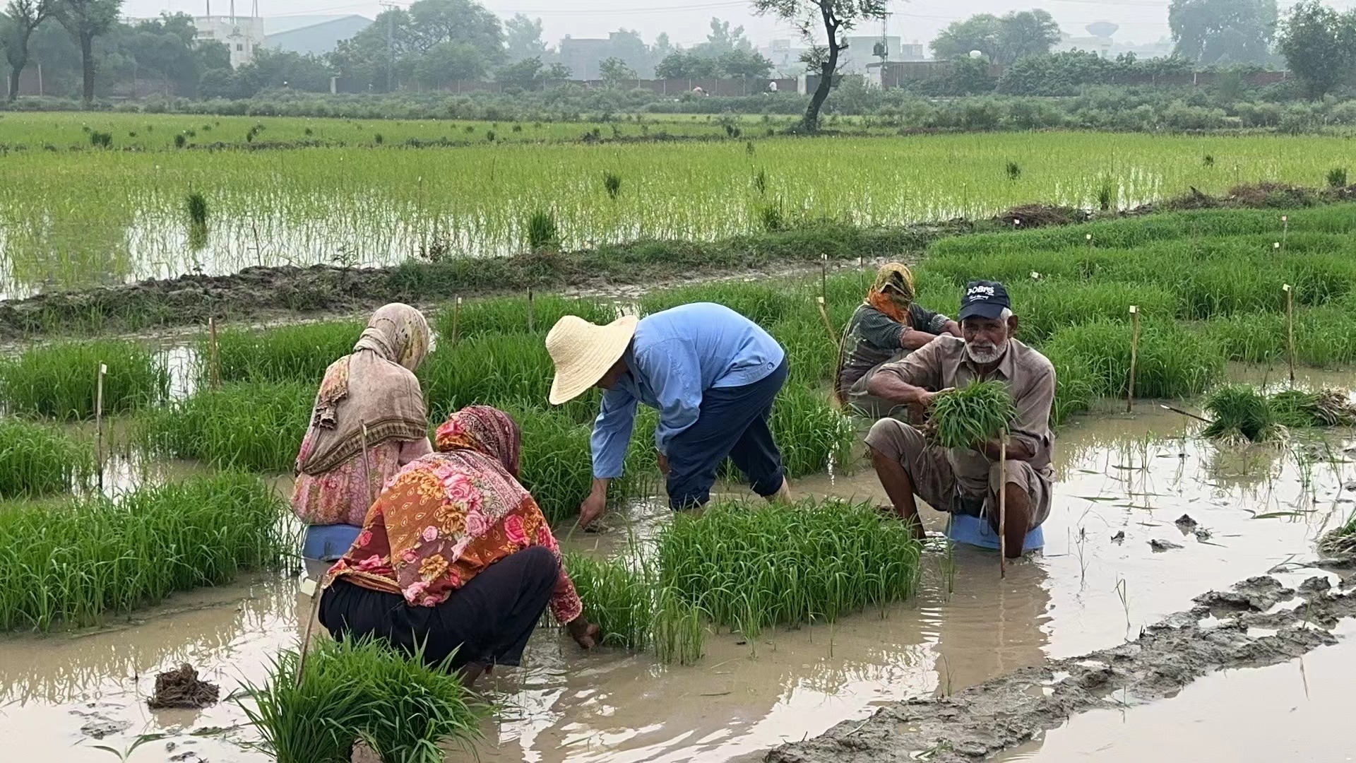 位于巴基斯坦東部旁遮普省首府拉合爾的雜交水稻育種站田里,龍春久頭戴黃草帽、身穿工作服、褲腳挽至膝蓋,赤足站在泥濘的水田里,彎著腰指導(dǎo)當(dāng)?shù)剞r(nóng)民們拔苗插秧,汗水如雨水般從他黝黑的面龐上淌下。